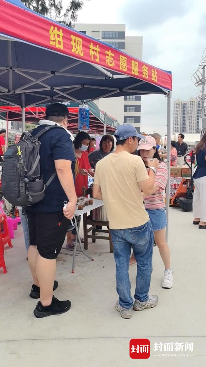 硬件升级的同时,暖心服务保障也同步跟进。在“莫氏鸡煲”店旁,专门搭建了绀现村志愿服务站。现场志愿者正一杯杯为食客分装海带绿豆水,“免费饮用,清热解腻,大家可以随便喝。”
