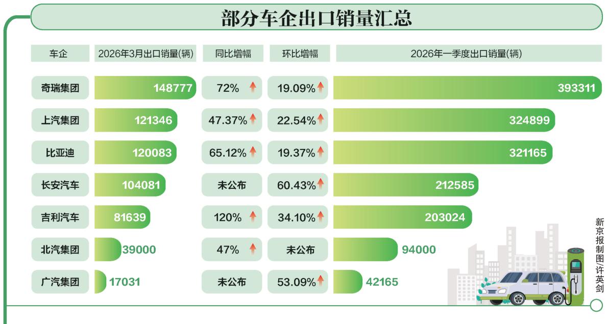 这股海外需求热潮,在今年3月中国汽车出口数据中体现得尤为明显。乘联分会4月9日发布的数据显示,今年3月乘用车出口(含整车与CKD)69.5万辆,同比增长74.3%,环比增长25.2%。其中新能源车占出口总量的50.2%,较2025年同期增加14个百分点。奇瑞、上汽、比亚迪3月出口销量领跑,均超过12万辆。