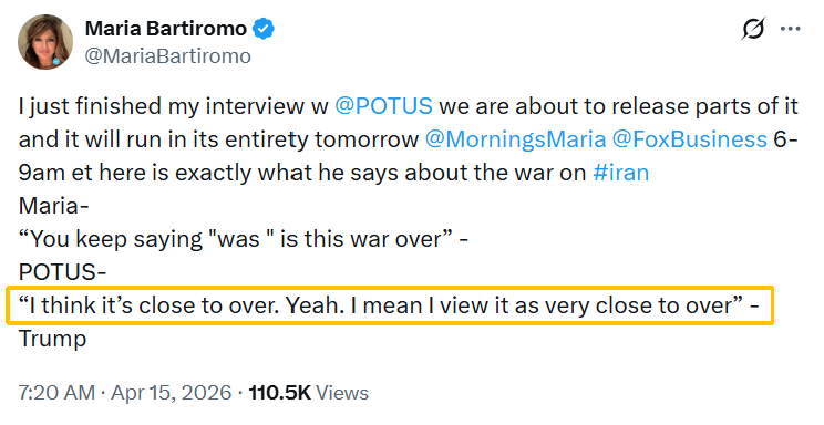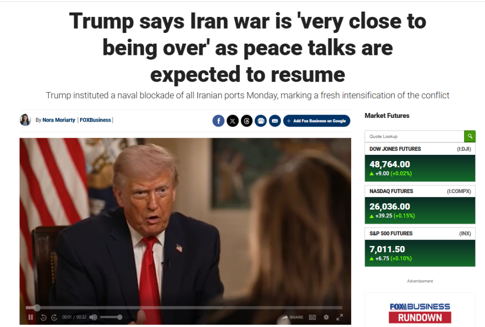 特朗普当天接受福克斯新闻频道记者采访。记者问,为什么“你一直在说‘战争结束了’”。特朗普回答说:“我觉得(伊朗战事)已经接近结束了。是的,我是说,我认为已经非常接近结束了。”